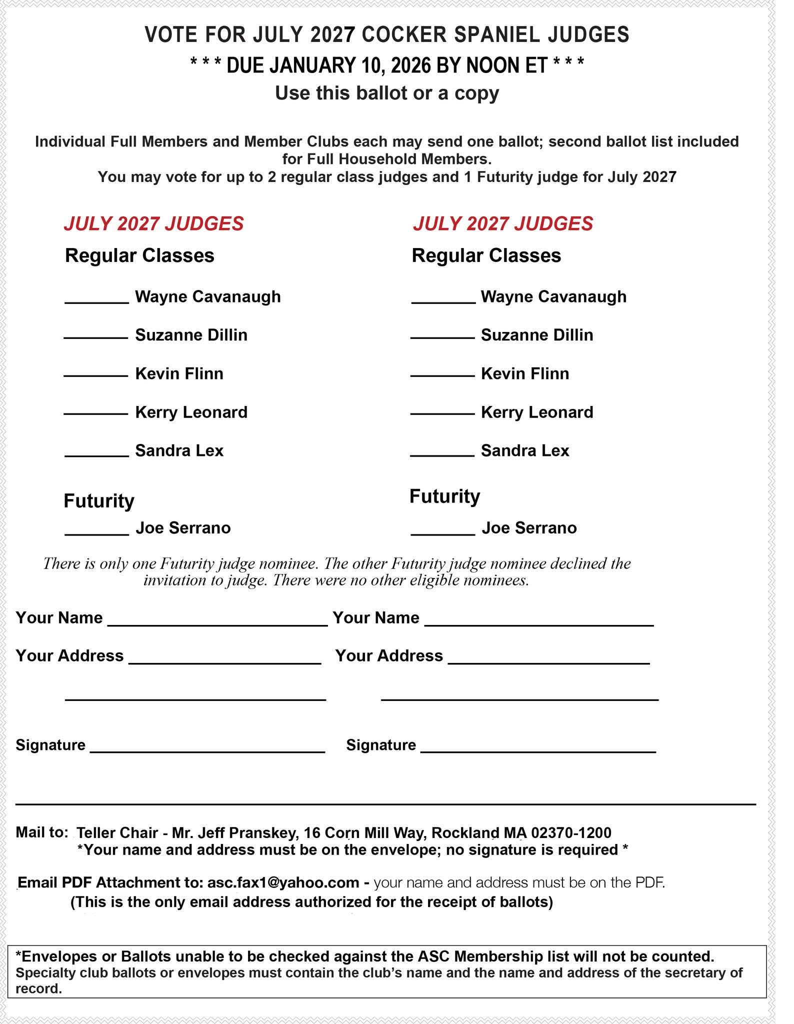 Vote: July 2027 Cocker Spaniel Judges Due January 10, 2026 – 12 p.m. ET See Ballot Deann Rogers2026-01-05T22:53:04-05:00January 5th, 2026|News| Share This... FacebookTwitterPinterestEmail Related Posts 2026 DUES NOTICE: ASC Membership 2026 DUES NOTICE: ASC Membership National and Zone Nominating Committee Reports National and Zone Nominating Committee Reports ASC and ASCF Health Registry & Rewards Program ASC and ASCF Health Registry & Rewards Program ATTN: ASC Members: Nomination and Voting Process Changes ATTN: ASC Members: Nomination and Voting Process Changes January 2027 ASC Flushing Spaniel Show Judges January 2027 ASC Flushing Spaniel Show Judges